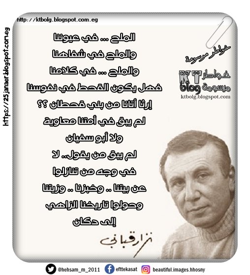 الملح ... في عيوننا والملح في شفاهنا والملح ... في كلامنا فهل يكون القحط في نفوسنا إرثا أتانا من بني قحطان ؟؟ لم يبق في أمتنا معاوية ولا أبو سفيان لم يبق من يقول (لا) في وجه من تنازلوا عن بيتنا .. وخبزنا .. وزيتنا وحولوا تاريخنا الزاهي إلى دكان