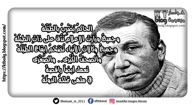 الحاكمُ يَضْرِبُ بالطَبْلَهْ وجميعُ وزارت الإعلام تَدُقُّ على ذاتِ الطبلَهْ وجميعُ وكالاتِ الأنباء تُضَخِّمُ إيقاعَ الطَبْلَهْ والصحفُ الكُبْرى.. والصُغْرَى تعمل أيضاً راقصةً في ملهى تملكهُ الدولَهْ